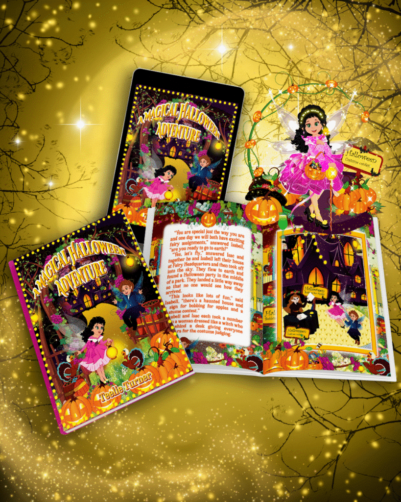 Let your imaginations soar this Halloween with Isabell and Isac as they, along with a group of mischievous fairy children, embark on an unforgettable journey! Spend a magical evening trick-or-treating in the amazing world of Teelie Turner’s A Magical Halloween Adventure. Follow Isabell and Isac as they explore the spooky attraction of their lovely neighborhood in their whimsical costumes. Listen to stories told by the fearless fairy children while you join in their quest to uncover candy treasures along the way!