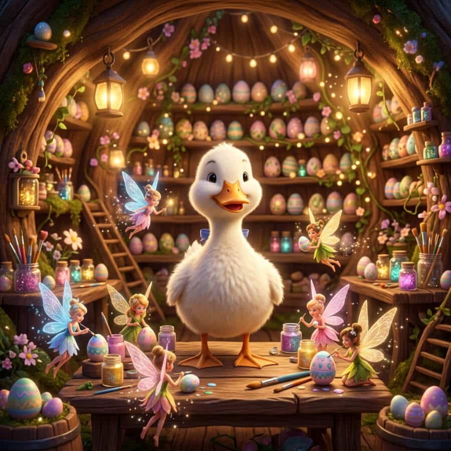 Luckily, Eliza isn’t alone. She receives help from some wonderful fairy friends, a group of cheerful bunnies, and even a friendly duck who all lend a hand to prepare the eggs for the big celebration.