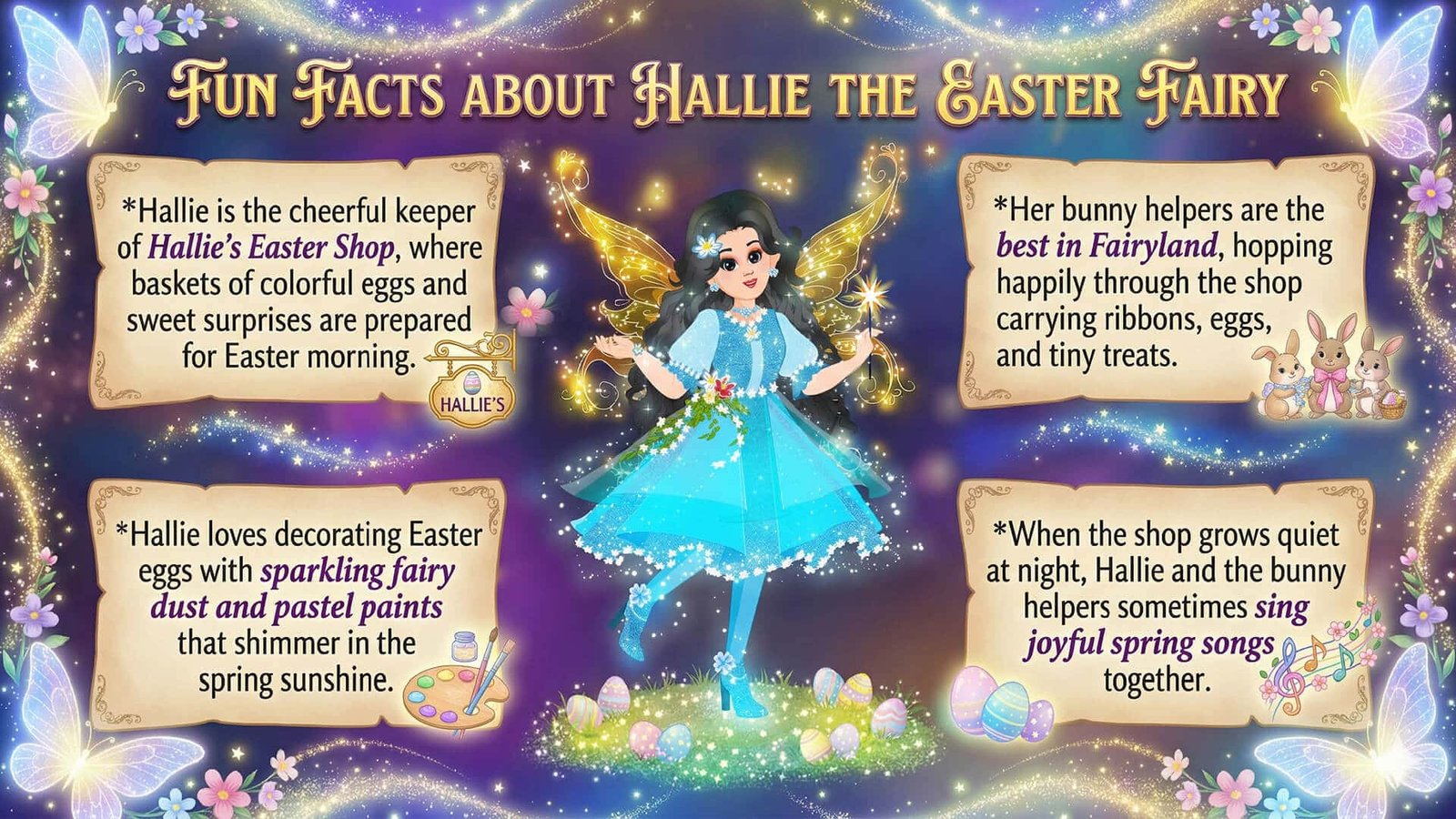 I’m Hallie the Easter Fairy, and I take care of a very special place called Hallie’s Easter Shop. My bunny helpers and I work together to decorate colorful eggs, fill baskets with sweet surprises, and sprinkle a little fairy magic wherever springtime blooms.