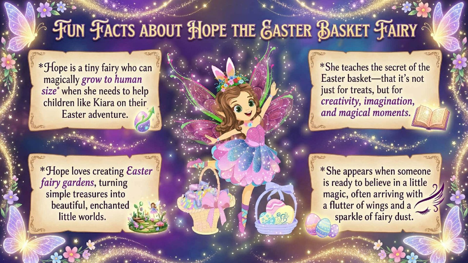 With a gentle flutter of sparkling wings, Hope the Magical Easter Basket Fairy appears and grows to human size, ready to reveal a secret far more wonderful than Kiara ever imagined. Together, they embark on a whimsical adventure, transforming simple treasures into a breathtaking Easter fairy garden filled with beauty, joy, and endless possibility.