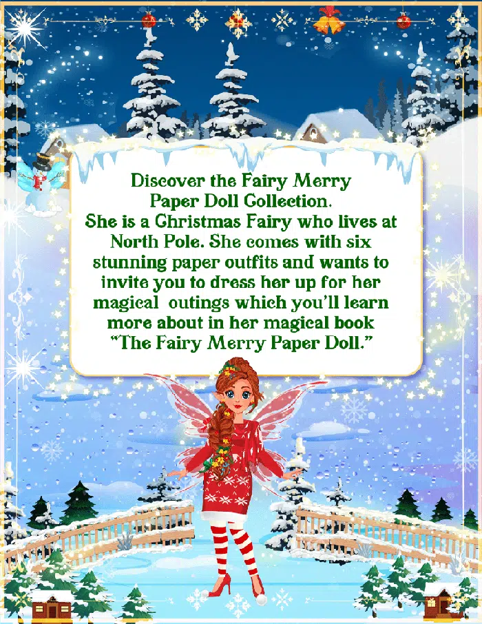 Step into a world of sparkle and snowflakes with the newly reformatted Fairy Merry Paper Doll Collection! Fairy Merry, the beloved North Pole Christmas fairy, has been transformed into a delightful paper doll you’ll absolutely adore. She’s Santa’s right-hand fairy during the holidays—but she also knows how to celebrate in style!